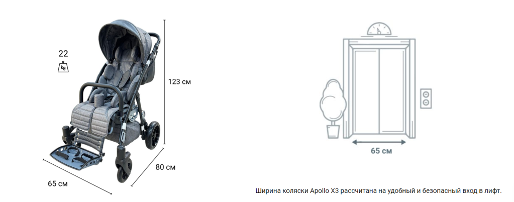 Специальная коляска APOLLO X3 имеет систему регулировки RZT (Я расту вместе с Тобой), которая позволяет плавно регулировать параметры сиденья (глубина от 25 до 37 см, ширина 18 (с подушками) — 40 см), спинки (высота от 57 до 70 см, ширина 18 (с подушками) — 34 см) и подножки (высота от 22 до 40,5 см).